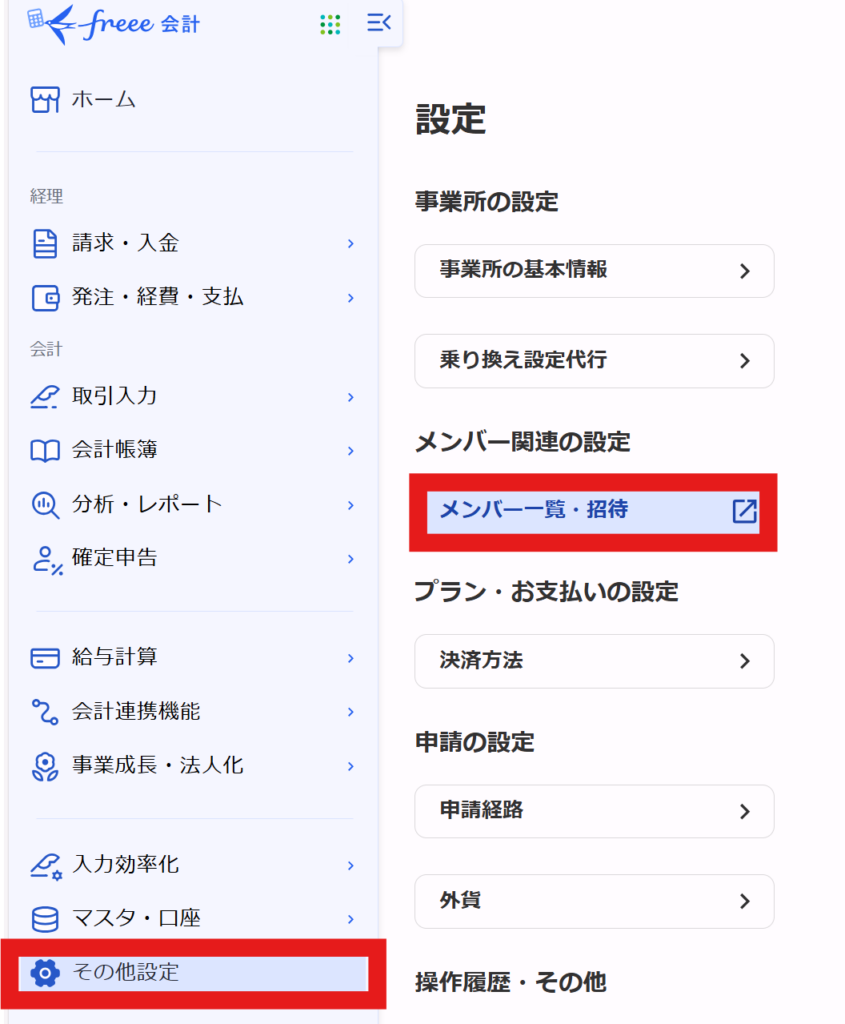 メニューの「その他設定」から「メンバー一覧・招待」をクリックします。