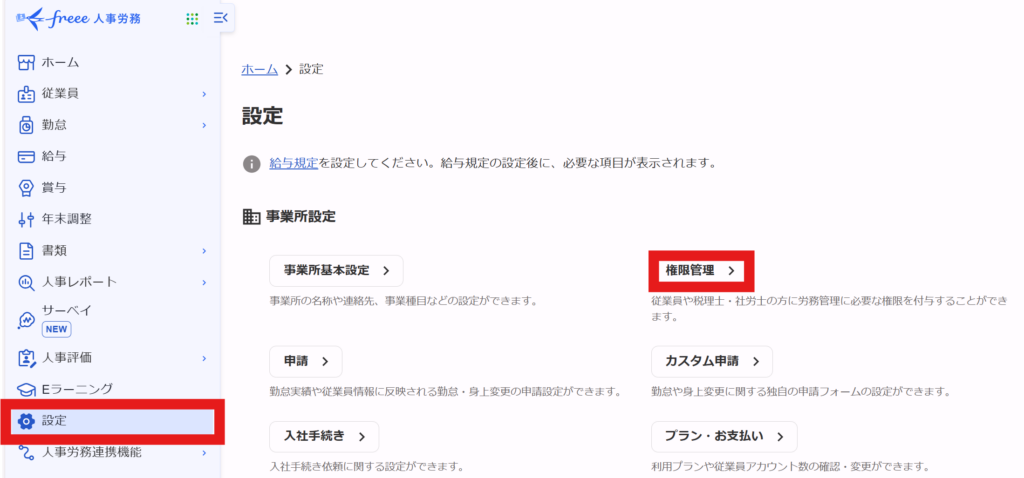 1.設定メニューを開く 右上の「設定」から「権限管理」を選択します。